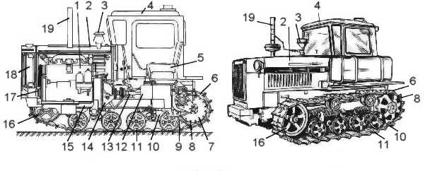 1- двигун, 2-капот двигуна, 3-повітрозабірник, 4-кабіна, 5-робоче місце машиніста, 6-цеп, 7-редуктор, 8-зірка, 9-задній міст, 10-еластично-балансувальна коретка, 11-каток, 12-коробка передач, 13-вал, 14-муфта зчеплення, 15-рама, 16-колесо що направляє, 17-гідронасос, 18-радіатор, 19-вихлопна труба.