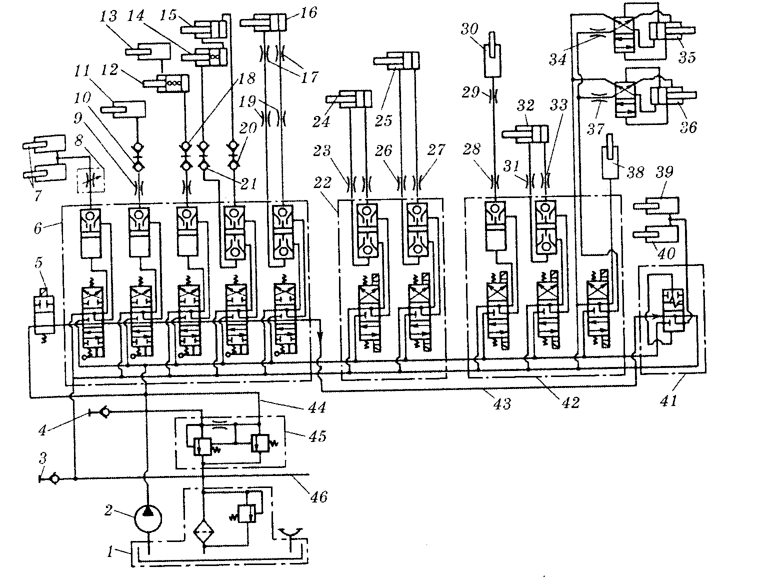 Рис.1 Принципова схема основного гідроприводу комбайна «Дон-1500»: 1 — бак; 2 — насос; З і 4 — півмуфти; 5 — гідроклапан з електромагнітним керуванням; 6 — розподільник з ручним керуванням; 7 — гідроциліндри піднімання і опускання жатної частини; 8 — дроселювальний регульований клапан; 9, 17, 19, 23, 26, 27, 28, 29, 31, 33, 34 і 37 — дроселі нерегульовані; 10, 18, 20 і 21 — з'єднувальні муфти; 11 — гідроциліндр варіатора мотовила; 12 і 13 — гідроциліндри вертикального переміщення мотовила; 14 і 15 — гідроциліндри горизонтального переміщення мотовила: 16— гідроциліндр механізму вмикання і вимикання робочих органів молотарки; 22 — двосекційний гідророзподільник з електрогідравлічним керуванням; 24 — гідроциліндр реверса жатної частини; 25 — гідроциліндр механізму вмикання і вимикання вивантажувальних шнеків бункера; 30 — гідроциліндр варіатора молотильного барабана; 32 — гідроциліндр повороту вивантажувального похилого шнека бункера; 35 і 36 — вібратори бункера; 38 — гідроциліндр відкриття заскочки клапана копнувача; 39 і 40 — гідроциліндри закриття клапана копнувача; 41 — розподільник керування копнувачем; 42 — трисекційний гідророзподільник з електрогідравлічним керуванням; 43 і 44 — трубопроводи лінії гідроприводу рульового керуваня; 45 — запобіжно-переливний клапан; 46 — трубопровід лінії гідроприводу рульового керування.