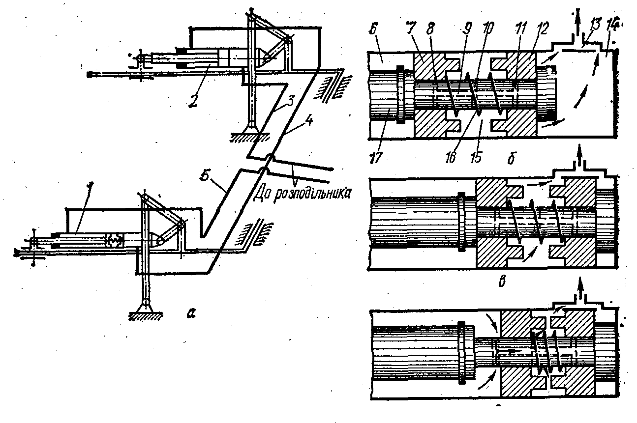 Рис.10.. Гідропривід горизонтального переміщення мотовила: а — схема; б, в , г — положення півпоршнів лівого гідроциліндра; 1 і 2 — гідроциліндри; 3, 4 і 5 — трубопроводи; 6 — штокова порожнина; 7 і 12 — півпоршні; 8, 10 і 11—радіальні отвори; 9 — осьовий канал; 13 і 14 — безштокові порожнини15 — міжпівпоршнева порожнина; 16 — пружина; 17 — шток.