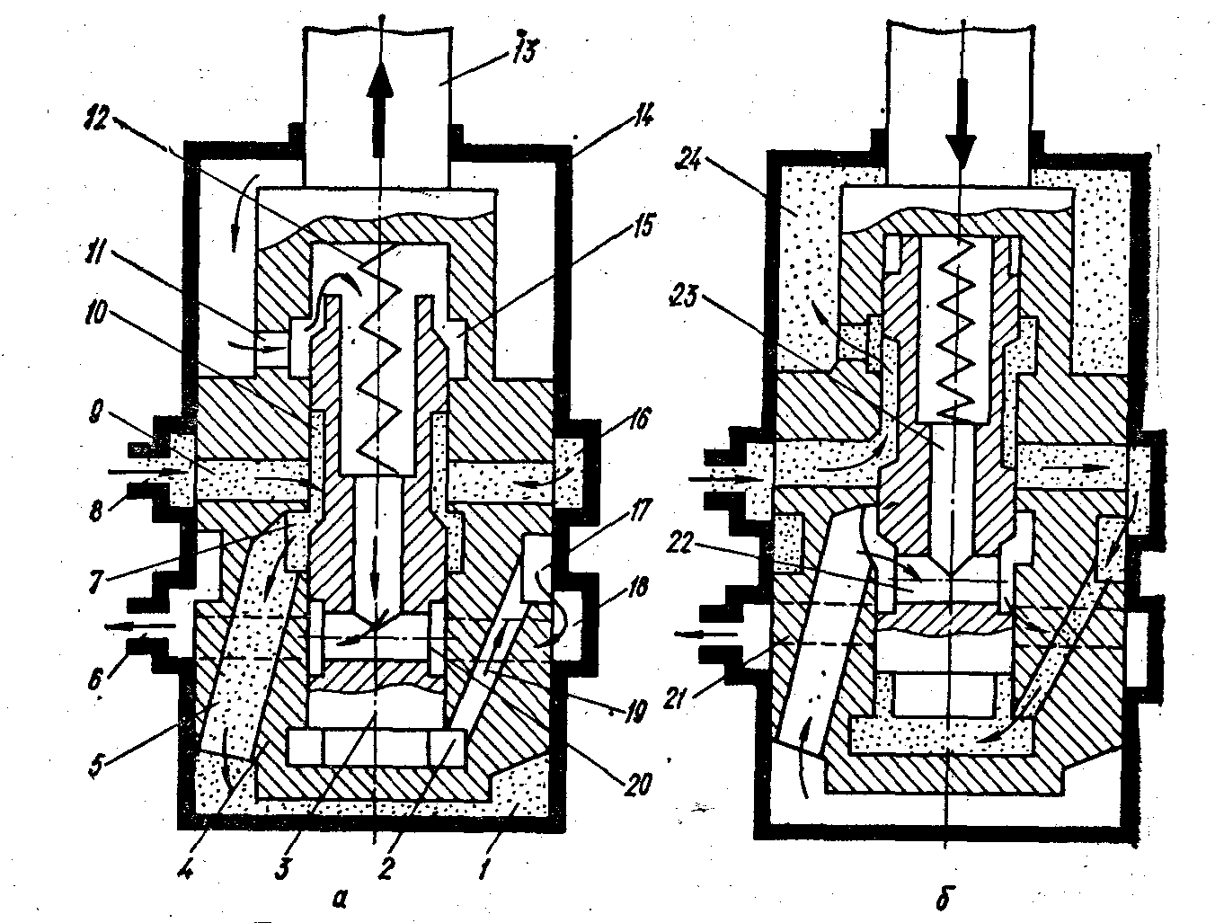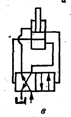 Рис. 8 Схема роботи вібратора при нижньому (а) і верхньому (б) положеннях та умовне позначення на принципових схемах (в): 1, 24 —нижня і верхня .порожнини корпуса; 2, 7 і 15—внутрішні кільцеві виточки поршня; 3 — золотник; 4 — поршень; 5 і 19 — косі отвори; 6 і 8 — отвори для зливання і підведення масла; 9 і 21 — наскрізні радіальні отвори поршня; 10 і 20 — кільцеві виточки золотника, 11— радіальний отвір поршня; 12 — пружина; 13 — шток 14 — корпус; 16 і 18 — кільцеві виточки поршня;17 зовнішня кільцева виточка поршня; 22 — радіальний отвір золотника; 23 — осьовий канал золотника.