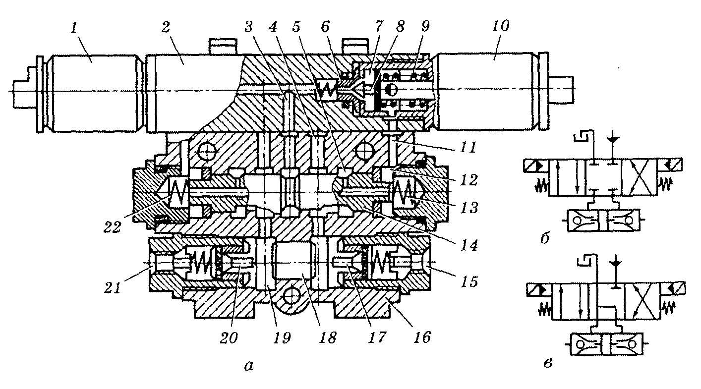 Рис.5. Секція гідророзподільника з електрогідравлічним керуванням: а — будова; 6— умовне позначення спрощене; в — умовне позначення детальне (злив рідини з порожнини гідрозамка); 1 і 10 — електромагніти; 2 — електромагнітна приставка; 3 — напірний канал; 4, 7, 12 і 19 -— порожнини; 5 — зливний канал; 6 — сідло; 8 — клапан; 9, 13 і 22 — пружини; 11 — канал керування; 14 — золотник; 15 і 21 — під'єднувальні отвори до порожнин гідроциліндра; 16 — корпус секції; 17 і 20 — запірні елементи клапанів гідрозамка; 18 — поршень.