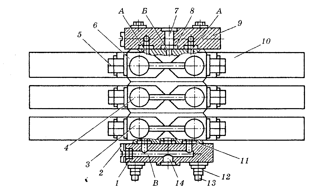 Рис.4. Трисекційний гідророзподільник з електрогідравлічним керуванням: 1, 9 кришки; 2 — заглушка; З, 4 і 6 — секції; 5 — під'єднувальний отвір трубопроводу до гідроциліндра; 7 — отвір напірної лінії; 8, 11 — ущільнювальні кільця; 10 — електромагнітна приставка; 12 — гайка; 13 — болт; 14 — отвір лінії зливу; А і В — канал зливу; Б — напірний канал.