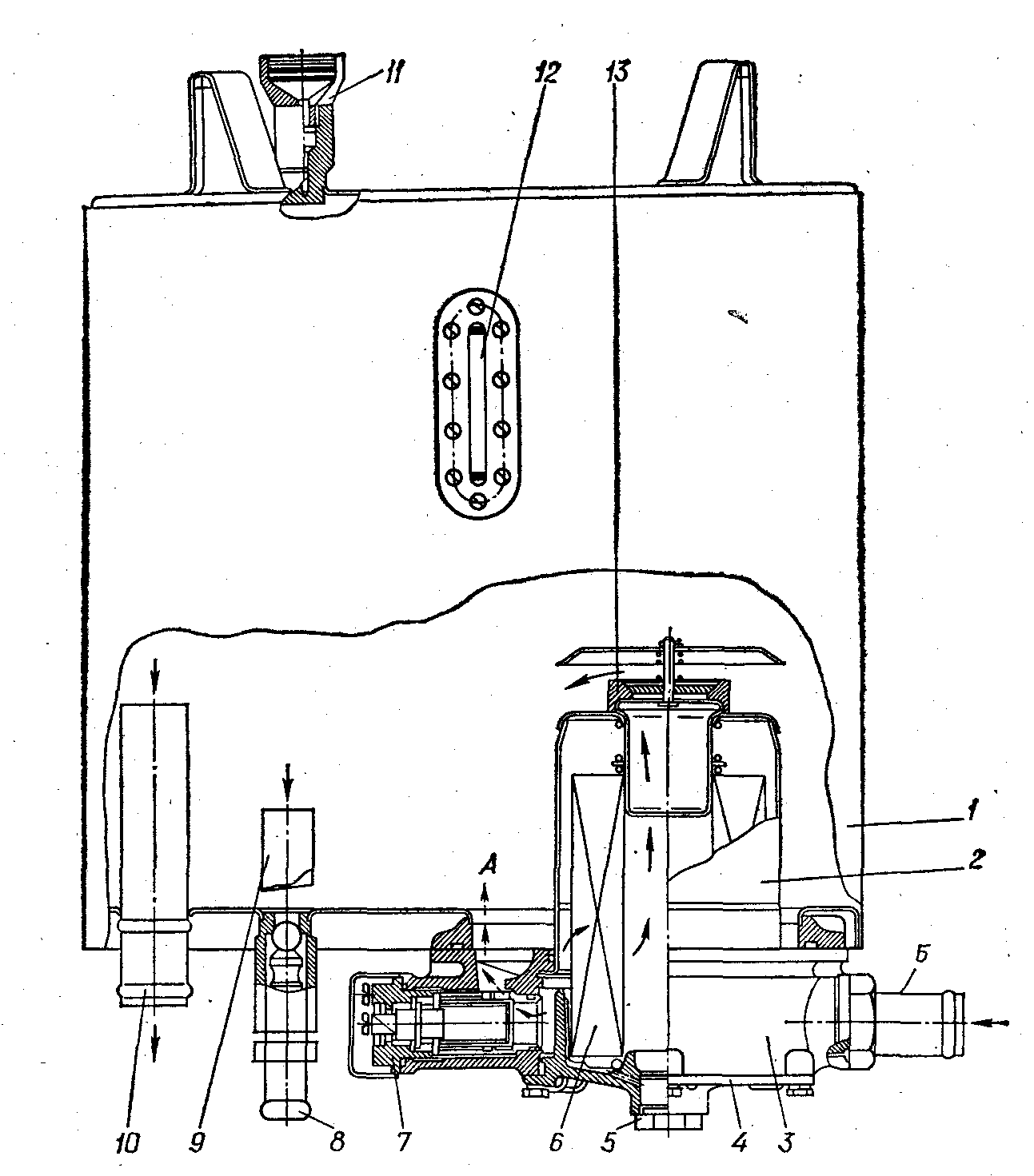Рис.2. Бак основного гідропривода: 1—корпус; 2 — стакан фільтра; 3 — фільтр; 4 —кришка; 5 — пробка; 6 — філь-троелемент; 7 — клапан-сигналізатор; 8 — зливний вентиль; 9 — всмоктувальний патрубок насоса НШ-10Е-3 гідропривода рульового керування; 10 — всмоктувальний патрубок насоса НШ-32-3 основного гідропривода; 11—сапун; 12 — маслопо- кажчик; 13 — зворотний клапан; А — зливання масла в бак при забрудненому фільтроелементі; Б — зливання масла з гідропривода.