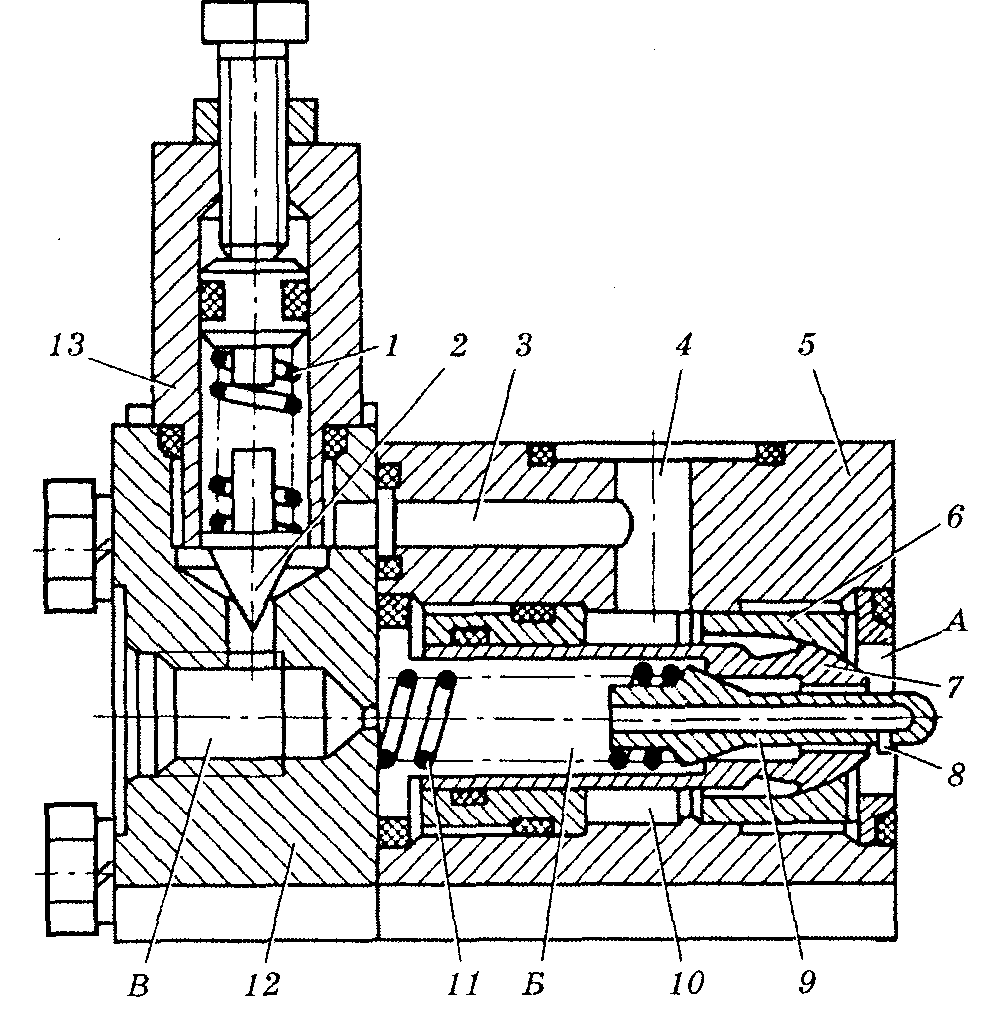 Рис. 6. Запобіжно-переливний клапан непрямої дії основного гідроприводу зернозбирального комбайна «Дон-1500»: 1>г> 11 — пружини; 2 — конус допоміжного клапана; З — зливний канал; 4 — зливний отвір; 5 — корпус переливного клапана; 6 — сідло; 7 — золотник; 8— дросельний отвір; 9 — осердя; 10 — кільцева виточка; -12 — кришка; 13 — корпус допоміжного клапана; А — порожнина напірної лінії; Б — післядросельна порожнина; В — порожнина лінії керування.