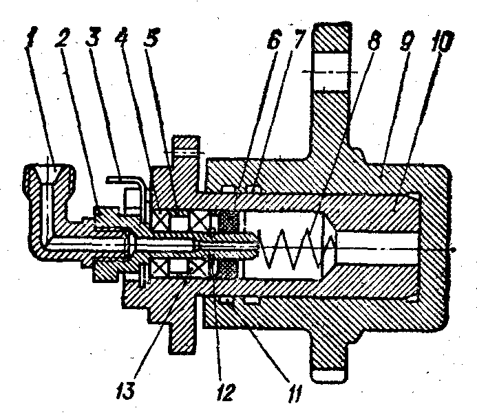 Рис.9. Плунжерний спеціальний гідроциліндр варіатора мотовила: І—кутник; 2— штуцер; 3 — шайба; 4 1 13 — підшипники кочення; 5 — розпірне кільце; 6 — манжета; 7 1 11 — ущільнювальні . кільця; 8 — пружина; 9 — гільза; 10 —плунжер; 12 — стопорне кільце.