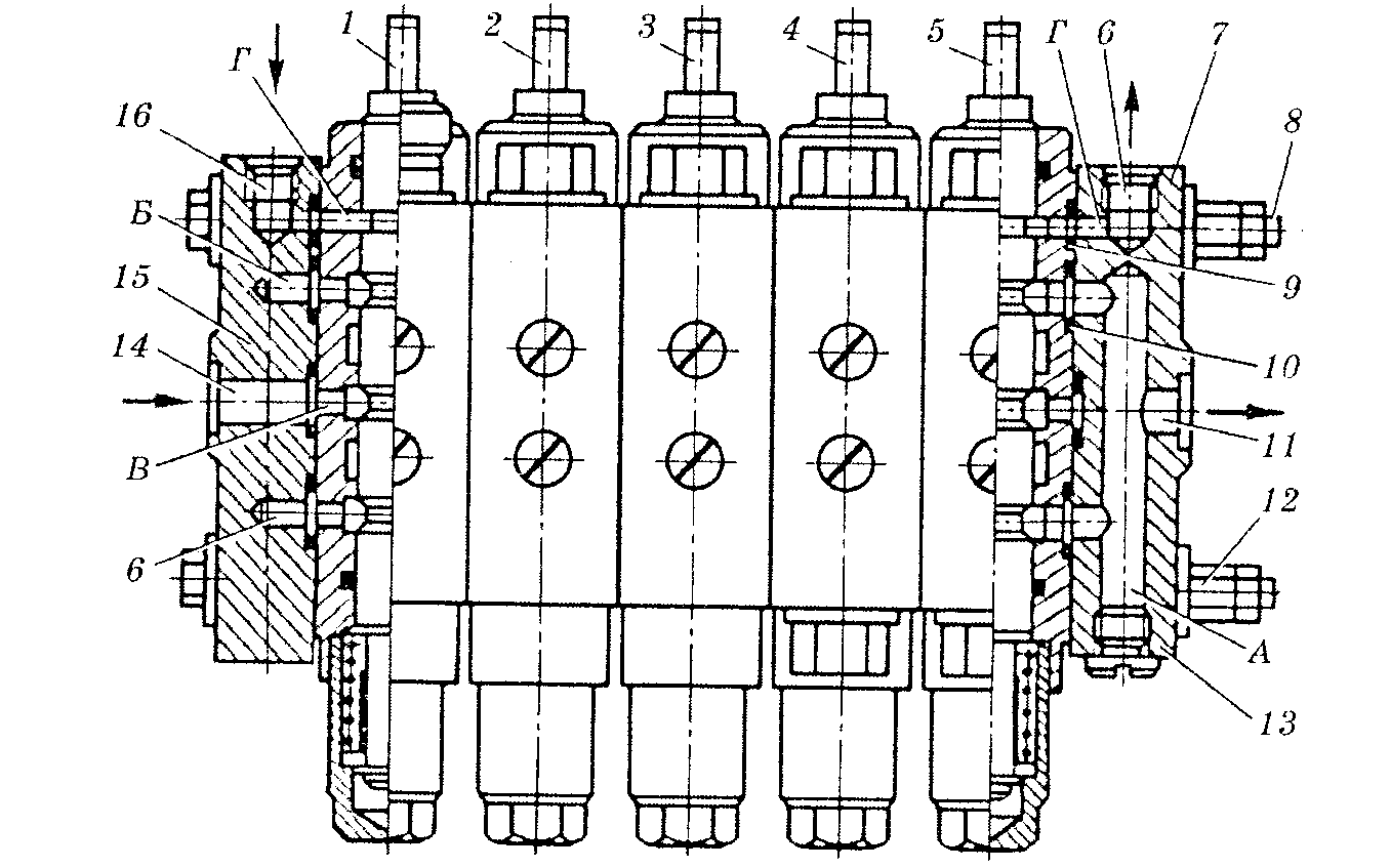 Рис.3. П’ятисекційний гідророзподільник з ручним керуванням: 1, 2, З, 4 і 5 — робочі секції; 6 — отвір для зливу рідини з лінії керування; 7 і 15 — кришки; 5 — болт; 9 і 10 — ущільнювальні кільця; 11 — отвір для відведення рідини }• лінію зливу; 12 — гайка; 13 — заглушка; 14 — отвір для підведення рідини із напірної лінії; 16 — отвір для підведення рідини з лінії керування; А, Б — зливні канали; В — напірний канал; Г— канал лінії керування.