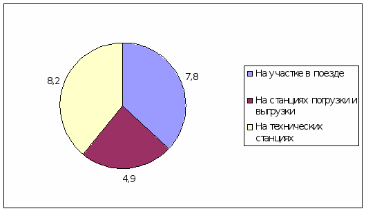 4. Оборот вагона в часах и сутках с выделением доли, приходящейся на время его нахождения на участках в поездах, на станциях погрузки и выгрузки, на технических станциях.