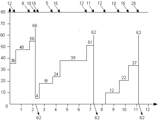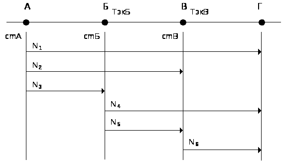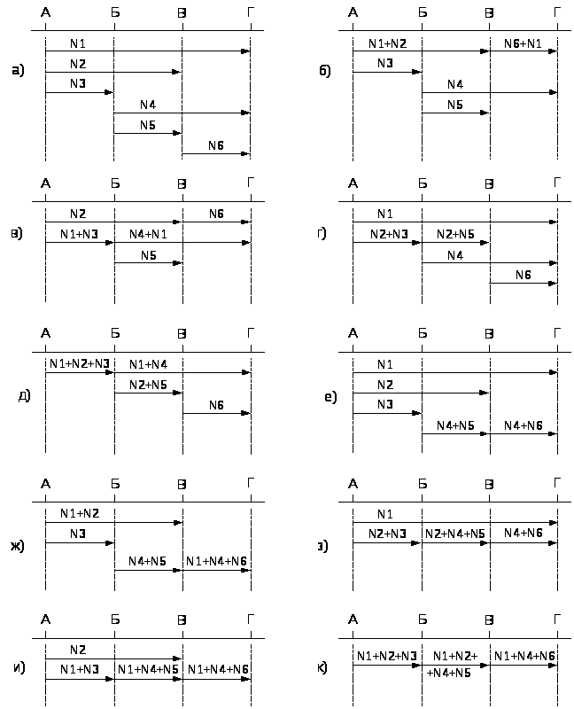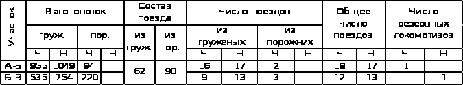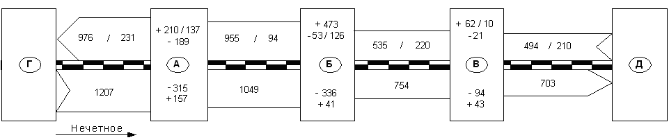 Для этого для каждой станции надо от числа отправленных груженых и порожних вагонов в четном и нечетном направлениях отнять собственную погрузку станции. В нашем примере для станций А, Б, В эта сумма рассчитывается следующим образом: