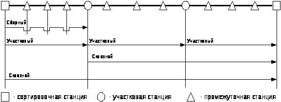 По условиям проследования до станций назначения различают поезда: сквозные – проходящие без переработки одну или несколько участковых или сортировочных станций; участковые – следующие без переформирования по одному участку; сборные – для развоза и сбора вагонов по промежуточным станциям участка; вывозные – следующие с сортировочной и участковых станций до отдельных промежуточных станций примыкающего участка или обратно – с отдельных промежуточных до ближайшей сортировочной или участковой станции; передаточные – следующие между станциями, входящими в один узел, и обслуживаемые парком специальных передаточных локомотивов.