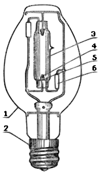 Четырёхэлектродная лампа ДРЛ состоит из внешней стеклянной колбы (1), снабжённой резьбовым цоколем (2). На ножке лампы смонтирована установленная на геометрической оси внешней колбы кварцевая горелка (разрядная трубка) (3), наполненная аргоном с добавкой ртути. Четырёхэлектродные лампы имеют основные электроды (4) и расположенные рядом с ними вспомогательные(зажигающие) электроды (5). Каждый зажигающий электрод соединён с находящимся в противоположном конце разрядной трубки основным электродом через токоограничвающее сопротивление (6). Вспомогательные электроды облегчают зажигание лампы и делают её работу в период пуска более стабильной.