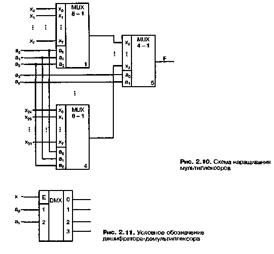 Пирамидальная схема, выполняющая функции мультиплексора «32–1» и построенная на мультиплексорах меньшей размерности, показана на рис. 2 10 (сокращение MUX от английского MUltipleXer).