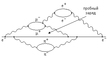 В основе идеи объединения различных взаимодействий лежит зависимость констант, слабого электромагнитного и сильного взаимодействий от расстояния. Из рис.1,3 видно как появляется такая зависимость. На рис. 1 показан механизм экранировки электрического заряда(*)электрона. Причина экранировки состоит в следующем: электрон может испускать виртуальные фотоны, которые в свою очередь могут превращаться в электрон - позитронные пары e + e - , пару м+м-, пару мезонов р+р-, K+K- и т.д. В результате взаимодействия отрицательно заряженного электрона с виртуально образующимися парами частиц происходит их поляризация (поляризация вакуума). Притяжение между противоположно заряженными частицами приводит к экранировке отрицательного заряда исходного электрона положительно заряженными e+, м+, р+-мезонами, располагающимися преимущественно ближе к электрону. Поэтому, при приближении пробного заряда к электрону, он будет чувствовать распределение поля виртуальных частиц. Т. е. величина измеренного заряда будет зависеть от расстояния между пробной частицей и электроном. Это называется в квантовой электродинамике экранировкой электрического заряда. Теоретические расчеты показывают, что с уменьшением расстояния величина наблюдаемого заряда растет, что и приводит к увеличению константы электромагнитного взаимодействия.