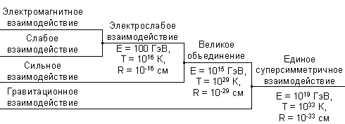 Как показали расчеты, сильное, слабое и электромагнитное взаимодействия в некоторый момент существования Вселенной были одним видом и только позже, по мере остывания вещества Вселенной, по родственному разошлись.