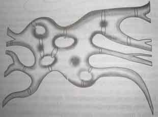Однако, все не так просто. Уравнения теории суперструн дают правильные решения только при одном условии - если наше пространство является 11-мерным! Т.е. в дополнение к привычному для нас 4-ех мерному пространству-времени (3 - протяженных пространства и 1 - временное), одновременно должны существовать еще 7 протяженных пространств. Но если наши привычные 4 измерения являются развернутыми, то остальные 7 измерений являются свернутыми и поэтому мы их не видим. Хотя они и существуют в каждой точке нашего пространства. Больше того, дополнительные пространственные измерения не могут быть свернуты произвольным образом: уравнения теории струн существенно ограничивают геометрическую форму, которую они могут принимать. Условиям уравнений удовлетворяет один конкретный класс многомерных геометрических объектов - пространство Калаби-Яу (или многообразие Калаби-Яу). Конечно, изобразить на рисунке это многомерное пространство достаточно сложно, но передать общие черты возможно. На рисунке 2 изображен один из вариантов этого многообразия.