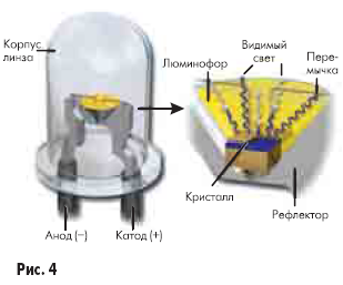 На рис. 4 показано строение 5-миллиметрового светодиода, излучающего белый свет.