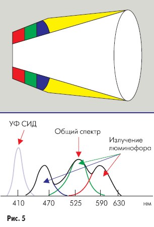 На рис. 5 показано получение белого света с помощью ультрафиолетового светодиода и RGB-люминофора.