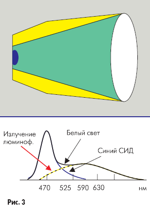 На рис. 3 показано получение белого света с помощью кристалла синего светодиода и нанесенного на него слоя желтого люминофора.