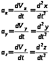 Проекция ускорения равны первым производным по времени от соответствующих проекций скорости или вторым производным по времени от соответствующих координат.