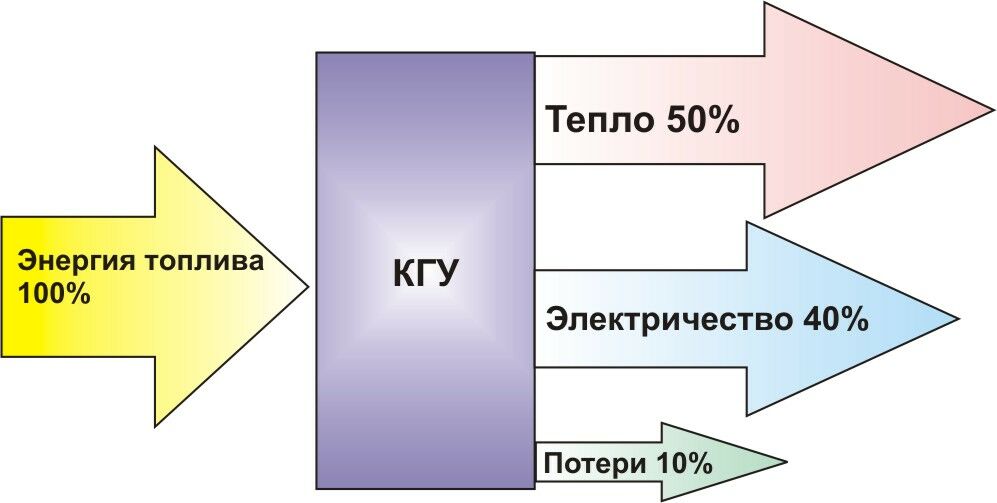 Таким образом, когенерация удовлетворяет потребности объекта в электроэнергии и низкопотенциальном тепле. Главное ее преимущество перед обычными системами состоит в том, что преобразование энергии здесь происходит с большей эффективностью, чем достигается существенное сокращение расходов на производство единицы энергии.