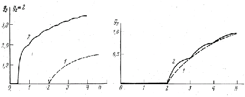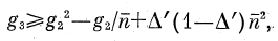 де . У класичній межі (п>1) (3.11) переходить в одну з нерівностей (3.1). Нескладно переконатися, що отримана нерівність (3.11) для g3 сильніша, ніж нерівність (3.2) при п=3. Відзначимо, що нерівність (3.11) не лише сильніше раніше відомого, але і встановлює нижній кордон для g3 в тих областях n де відома нерівність виявлялася тривіальною. Права частина (3.11) дає нам точний нижній кордон значень міри когерентності g3 як: функцію g2 і п. На рис. 3.2 приведені нижній кордон значень g3 згідно (2) і точний нижній кордон, розрахований по (11) (криві 1 і 2, відповідно) для полів, в яких g2—2.