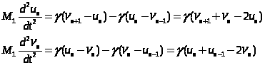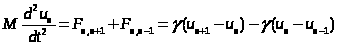 Первое слагаемое в правой части – сила, действующая на n-й атом со стороны n+1-го атома, второе – сила, действующая со стороны n–1-го атома.