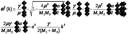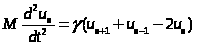 Если рассматривать только длинноволновые колебания, т. е. колебания с длиной волны много большей периода цепочки a, то можно заменить разность u>n>>+1>–u>n> на (∂ u>n>/∂ x)a, а величину, стоящую в правой части (2) – на γ a2(∂2 u/∂ x2). В результате получим волновое уравнение: