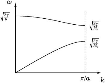 Поэтому достаточно рассматривать волновые вектора, лежащие в первой зоне Бриллюэна –π/a<k<π/a. Крайние значения волнового вектора ±π/a соответствуют одному и тому же колебанию с минимальной длиной волны λ = 2π/k = 2a. При такой длине волны соседние атомы цепочки движутся в противофазе. Интуитивно ясно, что короче длина волны быть уже не может.