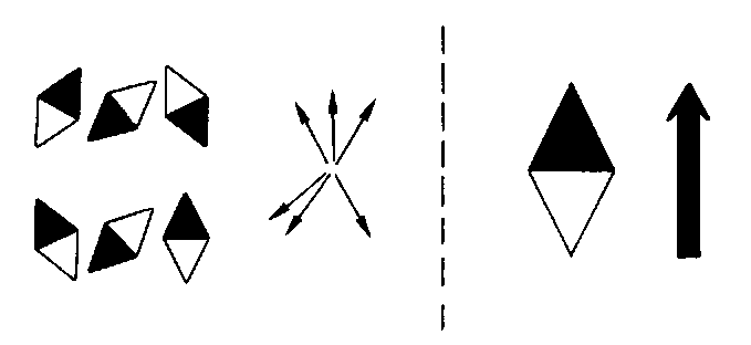 В неупорядоченном состоянии элементарные магниты ферромагнетика могут быть распределены по всем возможным направлениям. Такое распределение можно назвать симметричным: ни одно из направлений не имеет никаких преимуществ перед всеми прочими. При намагничивании же ферромагнетика все элементарные магниты вдруг оказываются обращены в одном и том же направлении; и хотя до фазового перехода все направления были равноправными, в этот момент происходит выбор одного определенного направления: существовавшая изначально симметрия направлений оказывается "нарушена" (рис.8).