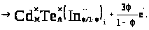 в) легування індієм. З врахуванням донорної дії In в CdTe [23], кристалоквазіхімічний аналіз досліджували за механізмом заміщення атомів індію вакансій кадмію в основній матриці (механізм заміщення) та вкорінення індію у міжвузля, тобто в ТП або ОП порожнини (механізм вкорінення).