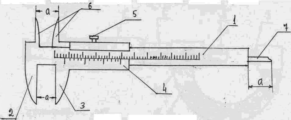 Основной его частью является линейка I с масштабом. Линейка снабжена двумя ножками: неподвижной и подвижной (2,3), последняя скреплена с рамкой 4, на которой нанесены деления нониуса, а рамка 4 может закрепляться на линейке I с помощью винта 5. Если сдвинуть ножки циркуля вплотную, то нулевые деления нониуса и основного масштаба должны совпасть. Иногда ножки 2 и 3 имеют с внешней стороны цилиндрические измерительные поверхности для измерения внутренних размеров отверстий, в этом случае - результат сложения отсчета по масштабу и нониусу и суммарной ширины ножек (указана на штангенциркуле). Часто штангенциркули имеют вторую пару ножек с заостренными концами, предназначенную, в основном, для разметочных работ. Наиболее универсальные штангенциркули снабжены выдвижной линейкой 7 для измерения размеров углублений. В этом случае одну измерительную поверхность представляет собою торец масштабной линейки, вторую - торец выдвижной линейки. Для измерения необходимо, предварительно определив точность нониуса, привести в соприкосновение измерительные поверхности и деталь, закрепить стопорный винт, снять нужные отсчеты и вычислить длину по формуле (3). Со временем приобретаются определенные навыки, и результат измерений определяется автоматически (без применения формулы). Наиболее употребительны штангенциркули длиной до 300 мм, но применяются и рассчитанные на гораздо большие длины.