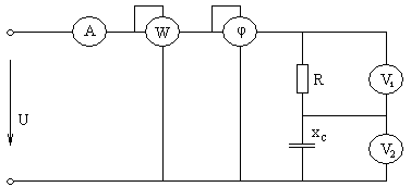 U = U >m> sin ωt промышленной частоты f = 50 Гц включены резистор и конденсатор. Определить показания приборов, реактивную и полную мощность цепи. Построить треугольник напряжений и векторную диаграмму напряжений.