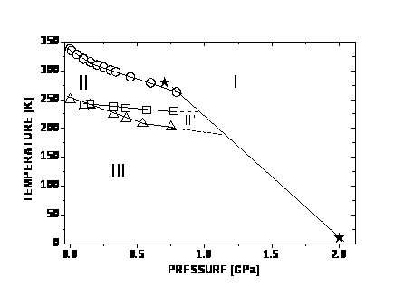Многие соли пиридина относятся к группе молекулярно-ионных кристаллов с межионными водородными связями. В зависимости от симметрии и размера анионов, эти соединения проявляют большое разнообразие интересных явлений – фазовые переходы, сегнетоэлектричество и динамический ориентационный беспорядок катионов пиридина [1-4]. Сегнетоэлектрическое состояние было обнаружено в тетрафторборате пиридина PyHBF>4> (C>5>H>5>NHBF>4>) [1], хлорокислом пиридине PyHClO>4> [2], рениевокислом пиридине PyHReO>4> [3] и йодокислом пиридине PyHIO>4> [4]. Интерес к изучению последних двух вышеперечисленных соединений связан с тем, что их температура Кюри близка к комнатной температуре. Однако, поведение параметров элементарной ячейки и межатомных связей дейтерированного рениевокислого пиридина (d>5>PyH)ReO>4 >при высоком давлении не исследовались. Зависимость параметров элементарной ячейки от давления можно исследовать с помощью рентгеновской дифракции. Однако этот метод не позволяет определить положение атомов водорода в структуре, особенно если там наблюдается ориентационный беспорядок водородосодержащих ионов. Эту информацию можно получить с помощью метода дифракции нейтронов. Выбор для исследований дейтерированного соединения C>5>D>5>NHReO>4>, изоструктурного с C>5>H>5>NHReO>4>, обусловлен лучшими характеристиками атомов дейтерия для экспериментов по нейтронной дифракции по сравнению с атомами водорода, которые имеют очень большое сечение некогерентного рассеяния нейтронов. Исследования кристаллической структуры дейтерированного рениевокислого пиридина (d>5>PyH)ReO>4> было проведено с помощью рентгеновской дифракции при давлениях до 3.5 ГПа при комнатной температуре и нейтронной дифракции при высоких давлениях до 2.0 ГПа и низких температурах до 10 К [5]. Обнаружено подавление сегнетоэлектрической фазы II под высоким давлением и стабилизация фазы высокого давления I. Характер фазовой диаграммы (d>5>PyH)ReO>4> указывает на существование тройной критической точки для фаз I, II и III при давлении около 1.2 ГПа (рисунок 1).