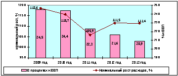 Рисунок 7. Расходы государственного бюджета в процентах к ВВП и их номинальный рост в 2009 – 2013 годах