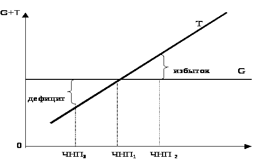 Дж. Кейнс особое значение придавал недискреционной бюджетно-налоговой политике, которая, по его мнению, способна амортизировать кризис. Встроенная стабильность возникает вследствие наличия функциональной зависимости между налогами и национальным доходом. Так, величина собираемого чистого налога варьируется пропорционально величине чистого национального продукта (ЧНП), следовательно по мере изменений уровня ЧНП возможны автоматические колебания (увеличение или уменьшение) размеров налоговых поступлений и возникающих бюджетных дефицитов и излишков. (рис.1)