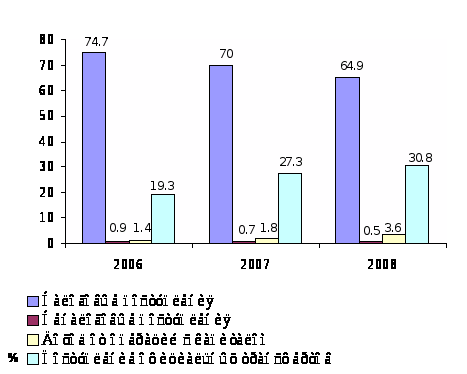 время является чрезмерно большая сфера бюджетного регулирования как следствие низкого уровня собственных доходов местных бюджетов. Причем в средствах бюджетного регулирования преобладают отчисления от общегосударственных налогов и субвенции из республиканского бюджета местным бюджетам. Согласно действующей системе объем изымаемых бюджетных средств устанавливается в абсолютной сумме по каждой области и району. Сам этот механизм напоминает инструмент, использованный при административно-командной системе, так как в нем нет экономического рычага стимулирования местных исполнительных органов в увеличении финансовых ресурсов и эффективном их использовании для решения социальных и экономических проблем в регионах [33].