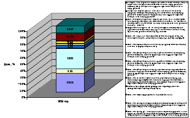 8. «Бесплатный отпуск медикаментов…» занимает ведущее место в структуре раздела 1 «Меры по сохранению уровня социальной защищенности льготных категорий граждан в условиях разграничения полномочий между федеральными и региональными» за 2006-2007 гг.» и составляет 30,82%. Второе место занимают расходы на статью 1.1 раздела 1 «Ежемесячная городская денежная выплата….», ее доля – 28,2%.