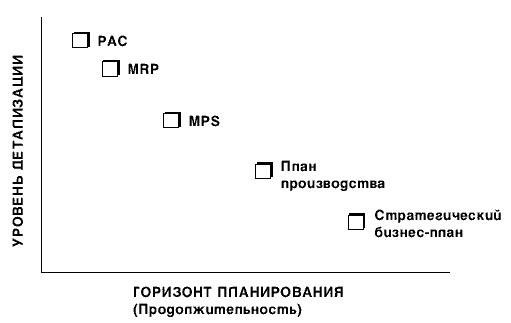 У кожного рівня своя задача, тривалість і рівень деталізації. В міру просування від стратегічного планування до контролю над виробничою діяльністю задача міняється від визначення загального напрямку до конкретного детального планування, тривалість зменшується з років до днів, а рівень деталізації збільшується з загальних категорій до окремих конвеєрів і одиниць устаткування.