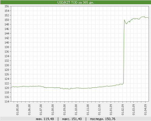 С начала 2008 года по январь 2009 года снижение курса тенге к доллару составило 1%. В 2008 году официальный курс тенге "дрейфовал" в районе 120 тенге/$1. Казалось, бури и штормы мирового финансового кризиса его не касаются.