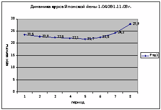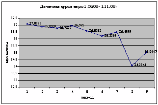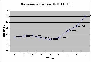 Валютой, которая постоянно скачет, является доллар. Если в начале года он стоил почти 24,5 рублей, в июле 2008 года он упал до 23,1 рублей, то сейчас он достиг 27 рублей [12]. «Учитывая сложившуюся ситуацию на международном валютном рынке, а также процессы, происходящие в экономике США, рассчитывать на устойчивую тенденцию к укреплению американской валюты в ближайшее время не приходится. Соответственно, на российском рынке, тенденция к укреплению рубля, вероятнее всего, также продолжится в связи с тем, что ЦБ сохранит курс на борьбу с ростом цен».
