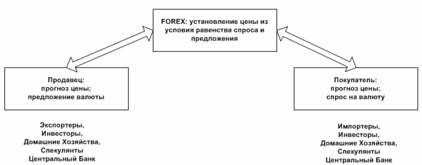 Ежедневное значение обменного курса формируется на валютном рынке таким образом, чтобы спрос на валюту совпадал по величине с предложением на нее. Ниже мы рассмотрим основных участников валютного рынка и механизм их влияния на спрос и предложение на валюту, а, следовательно, и на формирование валютного курса.