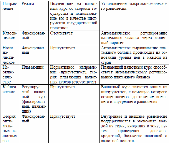 Для каждого из этих направлений характерен свой режим валютного курса, способ установления макроэкономического равновесия, наличие воздействий на валютный курс со стороны государства и использование его в качестве инструмента государственной политики (см. таблицу 2).