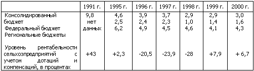 Несмотря на развитие кризисных процессов в сельскохозяйственном производстве, происходит ежегодное сокращение бюджетных средств, направляемых на его финансирование. Удельный вес расходов на сельское хозяйство и рыболовство в расходной части бюджетов всех уровней упал с 9,8 % в 1991 году до 3 % в 2000 году, или в 3,3 раза, а в валовом внутреннем продукте, соответственно, с 2,6 до 0,8 процента. Удельный вес господдержки в общих затратах сельхозтоваропроизводителей составляет крайне незначительную долю и практически не оказывает стимулирующего влияния на увеличение производства продукции и повышение его рентабельности (таблица 2). Уместно отметить, что в США и Европе идет интенсивное увеличение расходов государства на сельское хозяйство. В США совокупная поддержка возросла с 1997 по 1999 год с 14 до 24 %, в странах ЕС - с 38 до 49 процентов.