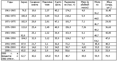 Грубые нарушения объективных закономерностей развития народнохозяйственного комплекса, допущенные в 90-е годы, незамедлительно проявились в экономике страны. Упадок и разрушение сельскохозяйственного производства как стратегической и важнейшей отрасли привели к кризисному состоянию многих отраслей, к дестабилизации экономики в целом.