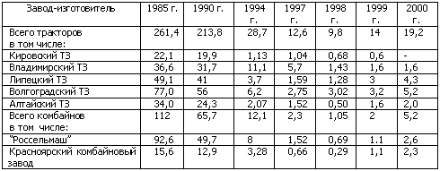 Для этого необходимо поставить селу около 1 млн. тракторов, 400 тыс. зерноуборочных и 150 тыс. кормоуборочных комбайнов единовременно. В обозримом будущем эта задача не разрешима. Даже при благоприятных условиях только через 3 года производство зерновых комбайнов может составить, по самым оптимистическим расчетам, не более 50 тыс. штук, тракторов - не более 80 тысяч. Это значит, что стабилизация по обеспечению техникой сельского хозяйства без принятия чрезвычайных мер может наступить через десятки лет.