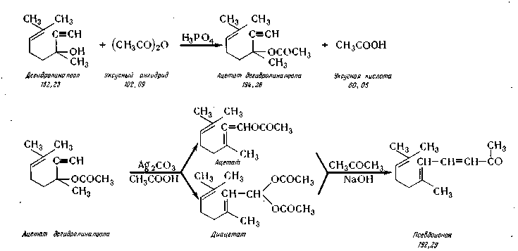 Псевдоионон. Псевдоионон получают из дегидролиналоола путем аци-лирования его, изомеризации ацетата, омыления его и конденсации с аце тоном в присутствии едкого натра. Синтез протекает по следующей схеме