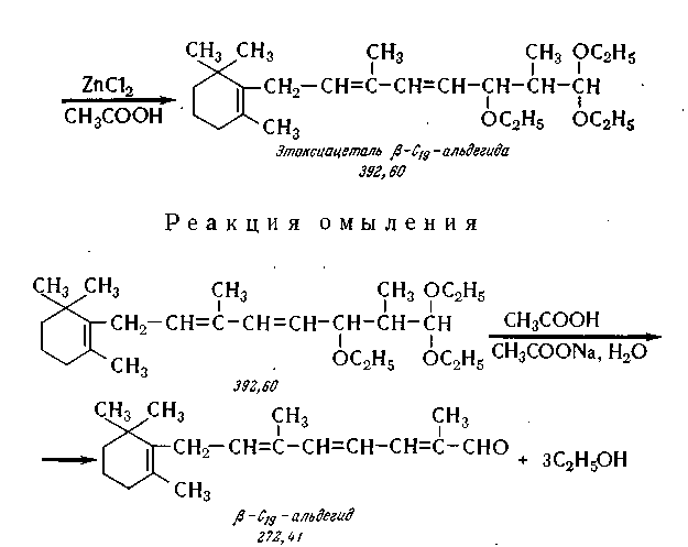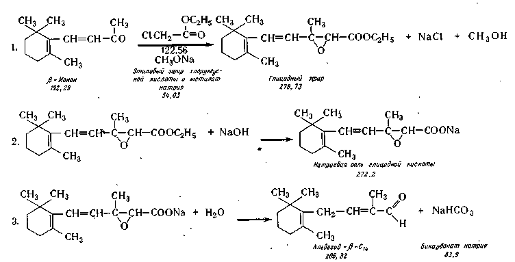 Синтез альдегида С>14> осуществляют по реакции Дарзана путем конденсации (3-ионона с метиловым или этиловым эфиром монохлоруксусной кислоты в присутствии метилата натрия. Реакции протекают по следующей схеме: