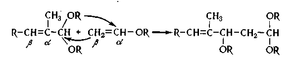Химические реакции получения альдегида С>16> заключаются в ацеталировании альдегида-С14, конденсации полученного ацеталя с виниловым эфиром в присутствии хлористого цинка и омыления алкоксиацеталя альдегида С>16>. Химизм реакций синтеза альдегида С>16> основан на склонности виниловых эфиров присоединяться к ацеталям а, (3-непредельных карбонильных соединений, причем одна алкоксигруппа [OR] перемещается от ацеталя к двойной связи винилового эфира. Остаток ацеталя присоединяется к β-углеродному атому винилового эфира. Конденсация и перегруппировка протекает по схеме: