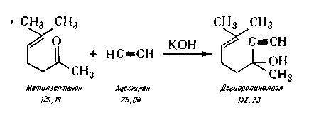 Дегидролиналоол (3,7-диметилоктаен-6-ин-1-ол-3). Дегидролиналоол синтезируют по следующей химической реакции: