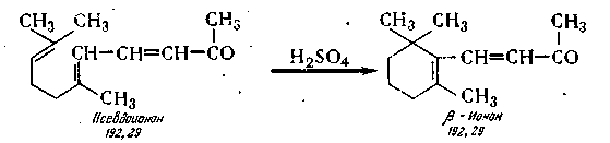 β-Ионон получают процессом циклизации псевдоионона под влиянием смеси концентрированной серной кислоты и ледяной уксусной кислоты в среде толуола по химической схеме: