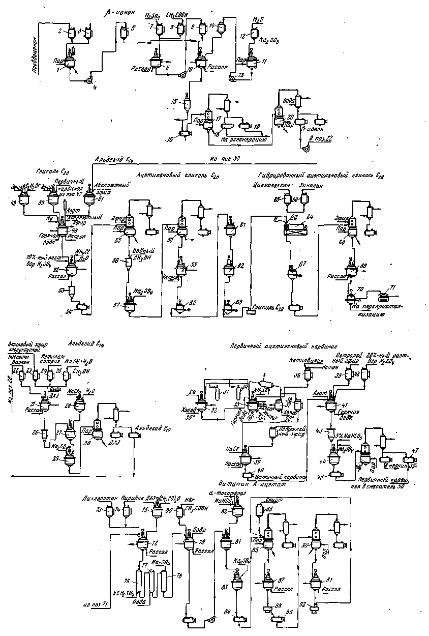 В реактор из нержавеющей стали 38 загружают из мерника 39 дегидролиналоол, из мерника 40уксусный ангидрид и из мерника 41 каталитическое количество фосфорной кислоты, перемешивают (температура не выше 50° С) и выдерживают 14—15 ч при температуре 18° С. Затем вводят в реактор из баллона 42 азот, нагревают реакционную массу до 90° С и добавляют каталитическое количество карбоната серебра, продолжая перемешивание 1,5 ч при температуре 90° С. Далее реакционную массу охлаждают до 20° С и передают под давлением в реактор 43, в который из мерника 44 загружают 20%-ный водный раствор хлористого натрия. После перемешивания разделяют слои в делительной воронке 45. В ней же промывают верхний слой раствором хлористого натрия до нейтральной реакции. Затем верхний слой переводят в реактор 46 и вводят в него из мерника 47 ацетон и из мерника 48,8%-ный водный раствор едкого натра, нагревают до 40° С и перемешивают 2,5—3 ч. Реакционную массу при температуре 20° С нейтрализуют уксусной кислотой из мерника 49. В делительной воронке 50 разделяют слои: нижний слой поступает в сборник 51, откуда далее направляют на регенерацию. Верхний слой промывают в колонке 52 раствором хлористого натрия. Промытый слой (технический псевдоионон) передают в сборник 53 и далее в вакуум-перегонный аппарат 54, снабженный колонкой, дефлегматором и конденсатором. Перегонку ведут при остаточном давлении 6—7 мм рт. ст., отбирают фракцию, кипящую при 131—135°С в сборник 55. Выход 54—55%.